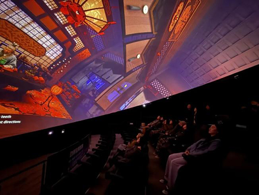 这里涵盖了诸多文化旅游产业领域的潮流应用,有动感球幕影院、飞行影院、建筑投影秀、《仙府传说》原创IP光影秀、沉浸式互动空间、3D/2D同屏显示系统、L型沉浸式虚拟现实协同工作系统、两面紧凑型CAVE、新一代飞行模拟器、透明显示、LED新一代技术和应用演示等。