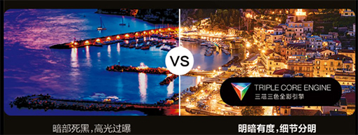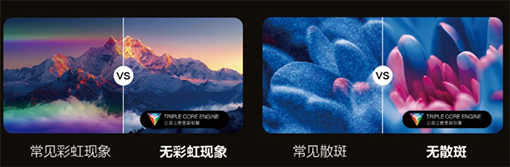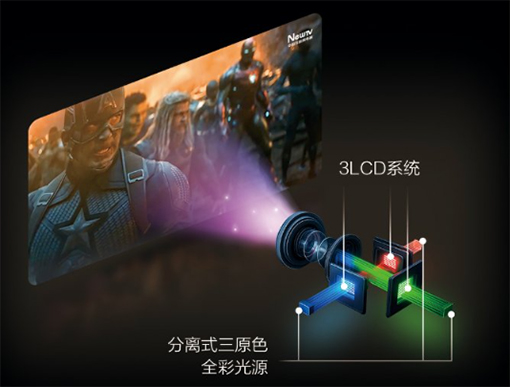 “三芯三色全彩引擎”,采用影院同源的三芯片技术,通过“三芯片+三色光源”架构,将红、绿、蓝三光源分别精准对齐3个LCD面板,相比传统3LCD技术的单色光源分光,能够有效降低光的损耗,从而提高投影画面的亮度表现;同时,三色光源的运用能够实现更广的色域,为投影画面带来更丰富的色彩表现。