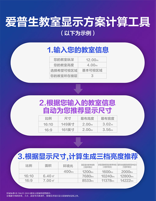 针对学校显示设备与教学空间不匹配的普遍痛点,爱普生依托全国多地高校的实地环境勘测经验,为您量身定制显示方案。用户只需提供教室的纵深、层高、楼层以及希望覆盖的可视区域,即可通过爱普生教室显示方案计算小工具计算出最适合的屏幕尺寸与设备亮度,确保“第一排不晃眼,最后一排看得清”。