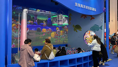 “泡泡海洋球投影趣玩”则凭借趣味十足的强互动体验,成为现场另一大“人气打卡点”。该方案采用1台20000流明*2*3的CB-PU2220B工程投影机搭配ELPLX02S镜头,无需复杂安装,即可实现无接触、强互动的墙面投射,支持“打地鼠”“打僵尸”“坦克大战”等多款卡通互动游戏。借助高速识别技术,设备可精准捕捉海洋球击打位置,命中瞬间即触发炫酷爆破动画、趣味音效与积分反馈,在轻松的游戏氛围中,充分激发参与者的探索欲和创造力,吸引了众多家庭的驻足和参与,现场孩童欢笑声不断。