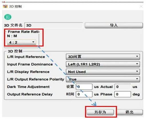3、进入3D设置界面,将N:M设置成4:2(单机播放48帧3D);3D控制各项参数,参照不同3D设备品牌提供的要求进行设置。