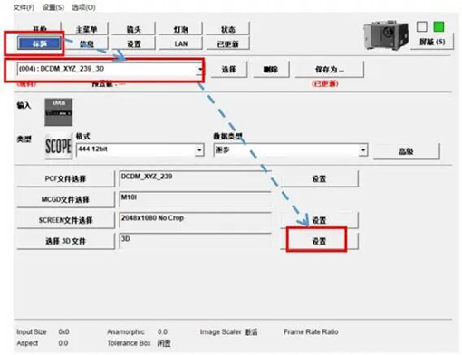 1、打开DCC软件,输入IP地址,与需要调试的放映机连通后,获取放映机的安装调试权限,点击以下按钮,在弹出的界面内选择设置,输入密码1111,点击确定。DCC软件安装调试教程见文末关联阅读!