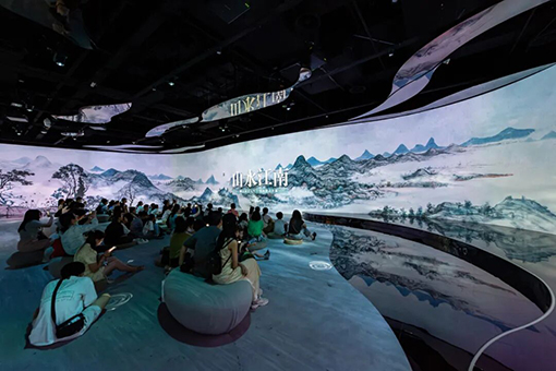 在2024年建成开放的上海博物馆东馆,除了传统的文物展出,还打造了一场名为《山水江南》的数字展。这个展运用数字技术构建了一个无实物展品陈列的中国古代绘画艺术多媒体、沉浸式的展示空间。
