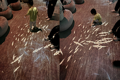 25台PT-FEQ080C投影机将墙面与地面变成艺术画布,孩子们可以"抓小鱼、追落花"互动体验。