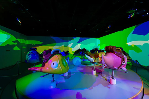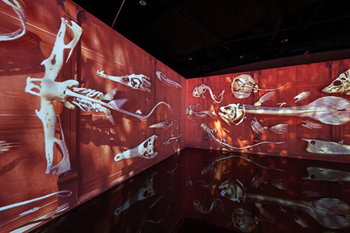 这里不仅有几十种真实的深海动物标本,更有运用松下投影机打造的精彩影像空间。展览中部,2台PT-FRQ080C投影机应用于直角墙面,配合镜子塑造出一个奇妙的空间。