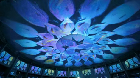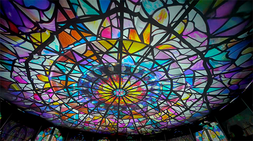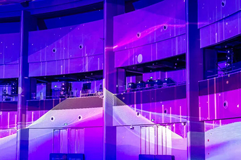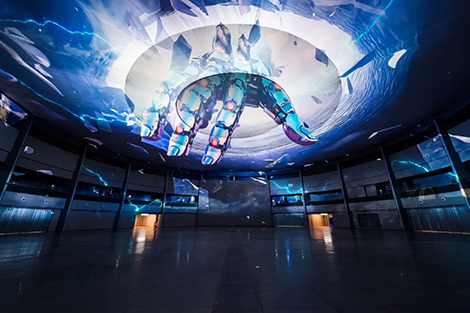 主会场西岸穹顶艺术中心的室内投影分为上下两个结构,第一部分为顶部巨大穹顶的投影,整个穹顶的直径约为60米,由18块结构构成,总面积约3000平方米。第二部分为穹顶下的环幕墙体投影,直径为60米,周长约190米,高度18.5米,总面积约为3500平方米。