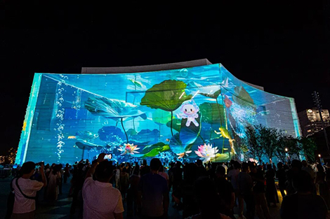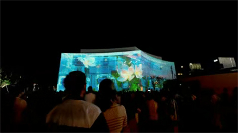 主会场西岸大剧院的光影秀位于剧院建筑的北侧墙体,总长86米,高度23.45米。剧院有着独特的外观造型,外立面采用凸起的直线型线条诠释“水岸涟漪”概念,北面墙体整体还呈夹角结构,这都为投影增加了难度。投影工程师们精心设计投影机安装位置与光路,确保观众可以在现场的多个角度都能随时观看到精彩的影像。