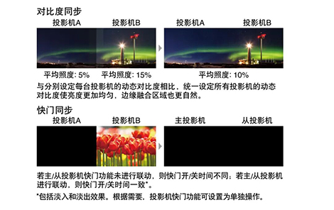 在多台投影机联动的情况下,允许通过局域网对其对比度进行同步调整。对比度同步功能说明。
