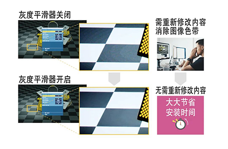当片源色彩深度不足时,投影画面就容易出现色带。系列工程投影机自带的灰度平滑器可减少这种灰度等级差异,免于重新修正片源内容,使用遥控器即可快捷操作。