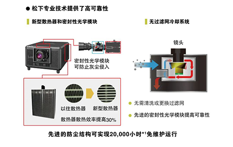 超过国际防尘标准的密封性光学模块和无滤网设计,可有效阻隔灰尘进入投影机内部,免维护运行长达20,000小时。