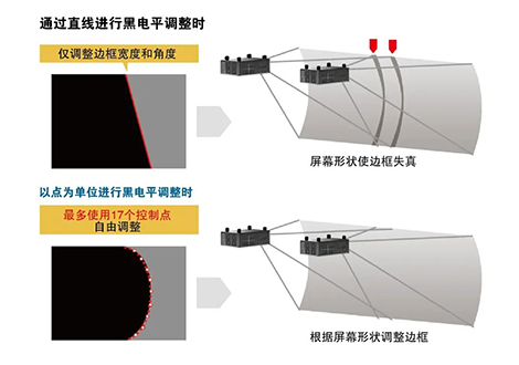 在曲面屏幕融合的应用场景下,无需外部软件,可使用投影机自带的黑电平调整功能,进行最多17个控制点的边缘调整,增强多屏应用的融合效果