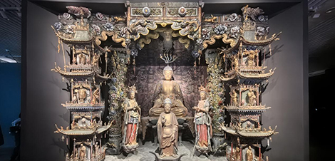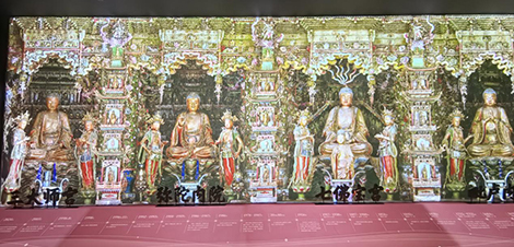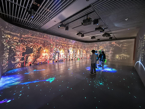 在展览的核心展区,数台松下激光工程投影机协同发力,将百亿面数的小西天悬塑超拟真数字模型转化为沉浸式影像盛宴。得益于松下投影机的高亮度稳定性与出色的色彩还原能力,沉浸影像空间精准复刻了悬塑的原始风貌,无论是鎏金装饰的细腻光泽,还是彩绘纹样的丰富层次,都与文物本体高度契合。步入其中仿佛瞬间“穿越”至小西天大雄宝殿,抬头可见诸佛垂眸,侧耳似闻飞天低语,那些因位置、光线限制在实体寺院中“看不清、看不全”的细节,在光影的加持下毫厘毕现。