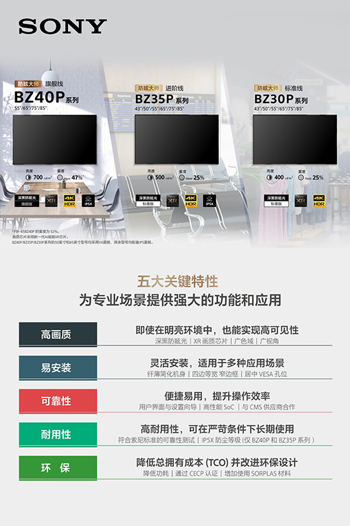 在数字化办公与商业空间重塑的进程中,企业协作、数字标牌及沉浸式零售等场景对显示设备的要求,越来越看重对复杂光环境的适应性、画质还原的精准度以及系统集成的灵活性。索尼作为显示技术的先行者,一直是行业的技术风向标。尤其是针对环境光干扰这一行业痛点,索尼将“深黑防眩光涂层”技术应用于产品,通过材料科学与光学涂层的创新,突破了显示屏在强光下反光与对比度损耗的技术瓶颈,确立了防眩光技术的标杆。业界对索尼商显产品的每一次升级换代均保持着高度关注。4月14日,索尼“防眩大师”系列商显2026新品品鉴会北京站举行,表达索尼对行业痛点的深刻理解,呈现全面升级的产品方案。