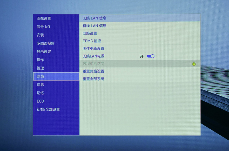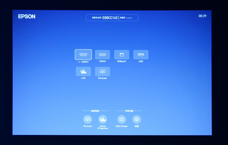 开机后可以看到爱普生投影机提供的简介主界面,可以直接选择视频源输入端口,并且可以进行无线投影设置,以及进入双屏幕模式以及快捷设置菜单。