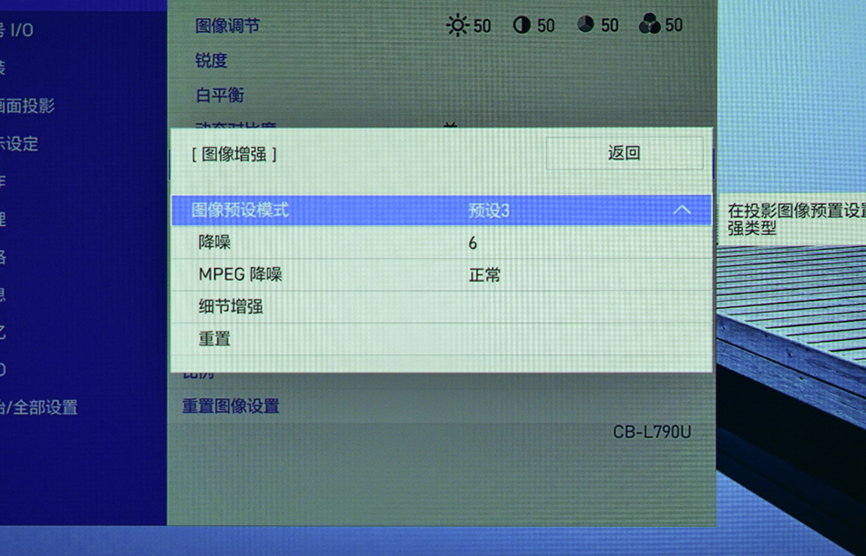 CB-L790U还拥有“图像增强”功能,通过算法来提升输入信号的最终呈现效果。“细节增强”可以智能分析并加强画面中物体的轮廓和纹理。“降噪” 可以消除画面暗部的噪点与颗粒感。“MPEG降噪” 可以有效识别并修复压缩视频的马赛克和抖动杂讯等瑕疵。