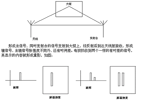 形成主信号,同时发射台的信号发射到大楼上,经反射后到达天线被接收,形成辅信号,主辅信号除强度不同外,还有时间差。电视机收到两个一样的有时差的信号,其显示的内容就形成重影,如图: