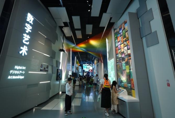 “数字艺术”(上)和“通信科技专馆”(下)等展厅的投影吸引了游客的关注