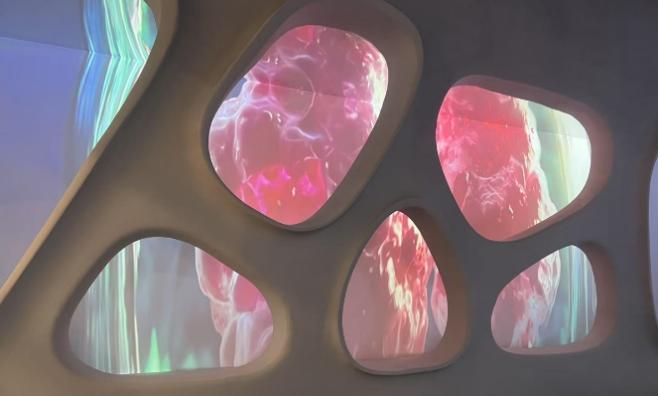 在三层的“身心奥秘”、“数字艺术”、“通信科技专馆”等展厅,建业显示通过异形投影、沉浸式影像和互动投影映射等多元技术,呈现兼具趣味性与教育意义的展示环境,用光影重塑科学认知,推动深圳科技馆成为重要的科普教育平台。其中,“身心奥秘”展区主打沉浸式互动体验,包括由科视Christie