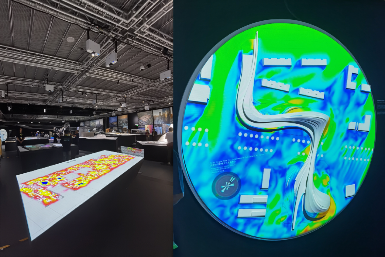 穿行于展览之中,欣赏各类设计新颖的建筑形态之余,投影机以科技的手段带给观众们更多设计理念与应用层面的信息传递。借助投影机模拟的建筑平面图演示,我们能够看到长时间建筑内人流的分布、疏散路线、职能区域划分等信息。通过影像,我们实现了“便捷一站式”的跳出“外在”看“内涵”,这或许是传统设计展难以企及的。