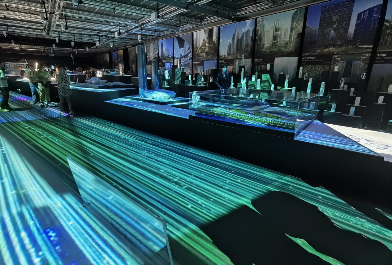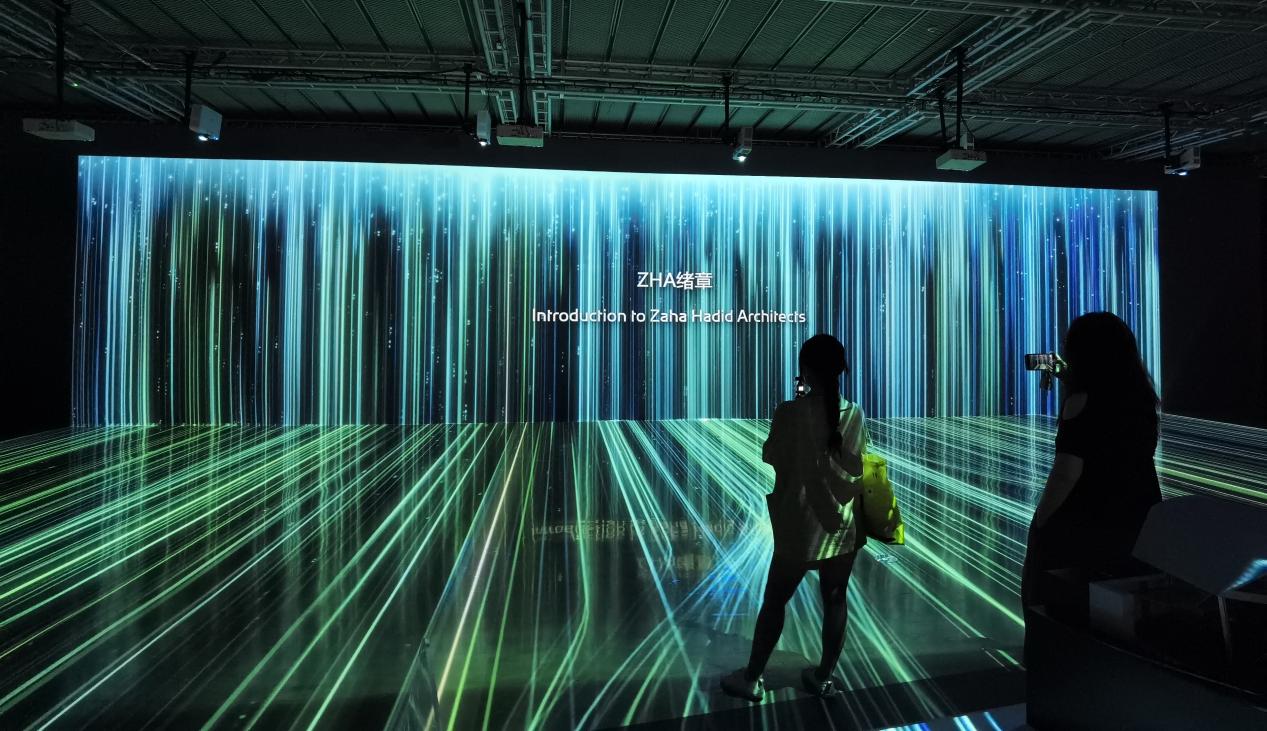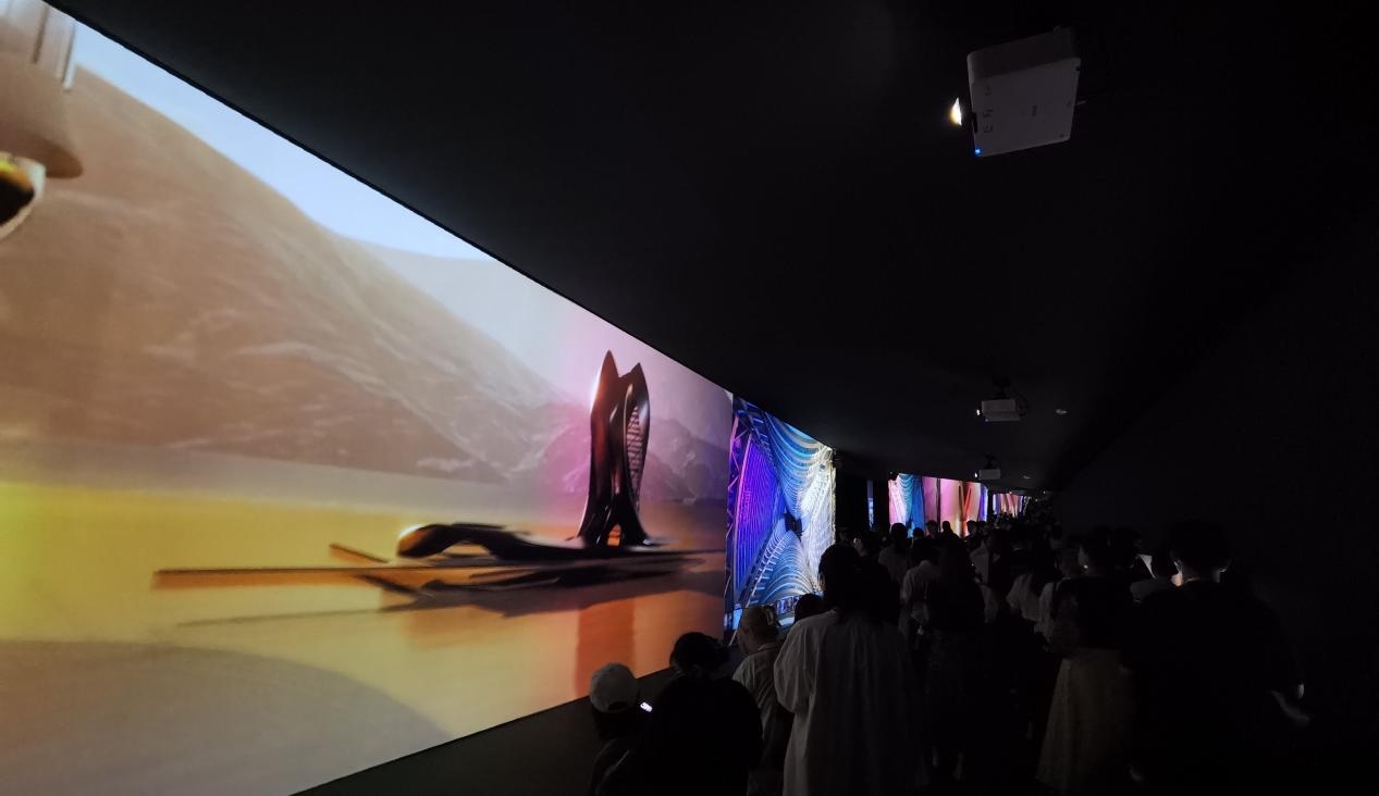 NFT数字藏品的概念近年来十分火热,在展览后方的“元宇宙通道”内,三台爱普生投影机横向融合投影,借助两侧的镜面在有限的空间内营造出无限延展的“艺术长廊”视觉效果。画面中演示的即为扎哈·哈迪德建筑事务所创作的虚拟城市建筑元宇宙作品,通过虚拟世界概念化的呈现让现实世界中的人们感受并有机会体验到更多设计理念前卫的建筑,穿行于交织着科技与灵感的城市中,让人体会“未来之境”并不遥远。