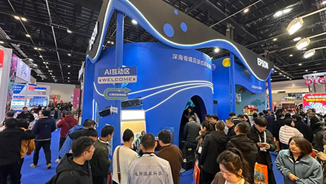 展会现场,爱普生以卓越的光影技术,为多元文旅游乐场景注入全新活力。其中,“深海奇景沉浸式球幕影院”凭借极具冲击力的视觉效果与超强沉浸式体验成为全场焦点。该方案由6台13000流明*1*2的爱普生4K*3高清工程投影机CB-PQ2213B与6只ELPLW05镜头共同呈现。依托爱普生3LCD核心技术的精准色彩表现,结合多机融合、弧面校正与无缝拼接技术,方案实现了360°穹顶覆盖式的沉浸式深海幻境。4K高清分辨率让画面细腻生动,鱼群穿梭、光影流动皆如临其境。现场观众置身其中,仿若潜入蔚蓝深海,开启了一场“人在画中游”的感官奇旅。