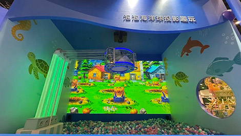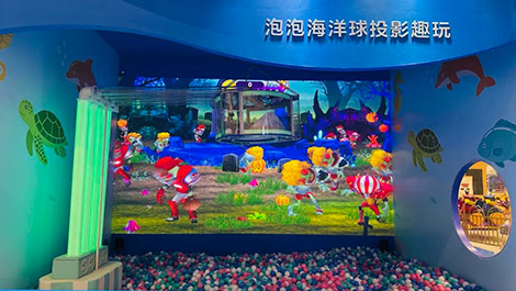 “泡泡海洋球投影趣玩”则凭借趣味十足的强互动体验,成为现场另一大“人气打卡点”。该方案采用1台20000流明*2*3的CB-PU2220B工程投影机搭配ELPLX02S镜头,无需复杂安装,即可实现无接触、强互动的墙面投射,支持“打地鼠”“打僵尸”“坦克大战”等多款卡通互动游戏。借助高速识别技术,设备可精准捕捉海洋球击打位置,命中瞬间即触发炫酷爆破动画、趣味音效与积分反馈,在轻松的游戏氛围中,充分激发参与者的探索欲和创造力,吸引了众多家庭的驻足和参与,现场孩童欢笑声不断。