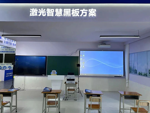 K12常规教室场景——“激光智慧黑板方案”:以4K增强*1分辨率超短焦激光投影机为核心,搭配120寸定制一体化激光智慧黑板*2,打造适配标准教室的超大尺寸教学显示终端。超短焦近距离投射设计,有效避免投影光线对教师眼部造成眩目,同时减少授课时的画面阴影干扰,让板书书写与智慧黑板交互更顺畅、教学更专注。