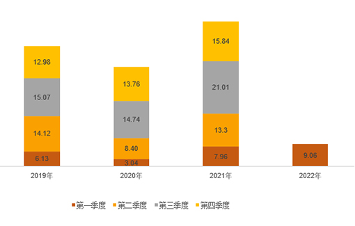 鸿合科技2019-2022年公司分季度营收情况(亿元)