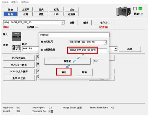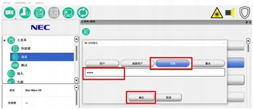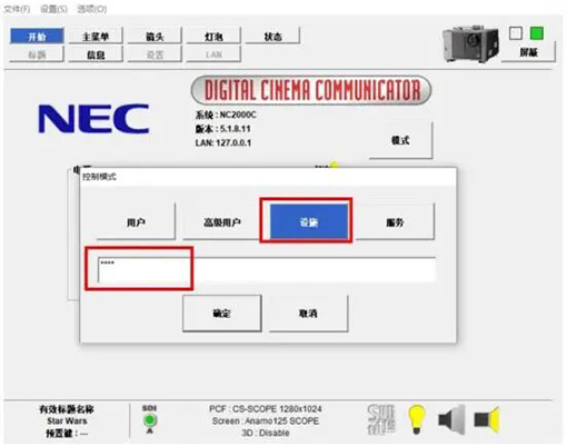 1、打开DCC软件,输入IP地址,与需要调试的放映机连通后,获取放映机的安装调试权限,点击以下按钮,在弹出的界面内选择设置,输入密码1111,点击确定。DCC软件安装调试教程见文末关联阅读!