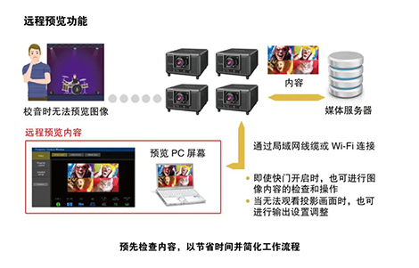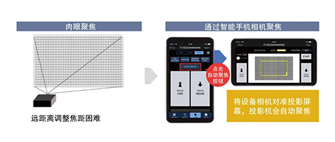 使用手机,最多可以对64台投影机进行开机、关机、输入选择、设置调整、镜头调整等操作,在最远30米的距离进行自动聚焦。