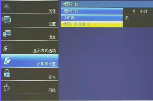 为提示用户定期清洁投影机过滤网,投影机会记录过滤网的使用时间并依照设定时间提醒使用者。因此,在清洁过滤网后,请不要忘记在【滤网计数】菜单中进行过滤网使用时间复位,以确保计数器的准确性。