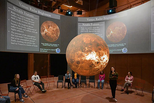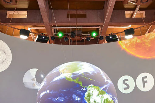 另一大难点在于实现球体投影与外围的环幕投影画面的精准同步。该项目由获得美国国家海洋和大气管理局(NOAA)"科学球体"(Science
