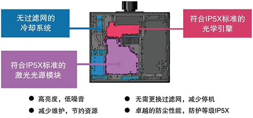 应用IP5X防尘等级的光学引擎和激光光源模块,并通过松下专有标准的粉尘环境测试,设备无需安装空气滤网,可在多尘的环境下运行长达20,000小时,免于设备的频繁维护。