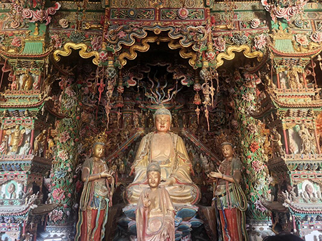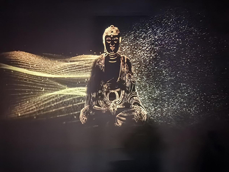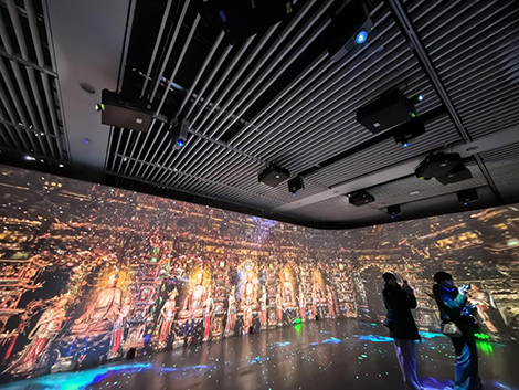 在展览的核心展区,数台松下激光工程投影机协同发力,将百亿面数的小西天悬塑超拟真数字模型转化为沉浸式影像盛宴。得益于松下投影机的高亮度稳定性与出色的色彩还原能力,沉浸影像空间精准复刻了悬塑的原始风貌,无论是鎏金装饰的细腻光泽,还是彩绘纹样的丰富层次,都与文物本体高度契合。步入其中仿佛瞬间“穿越”至小西天大雄宝殿,抬头可见诸佛垂眸,侧耳似闻飞天低语,那些因位置、光线限制在实体寺院中“看不清、看不全”的细节,在光影的加持下毫厘毕现。