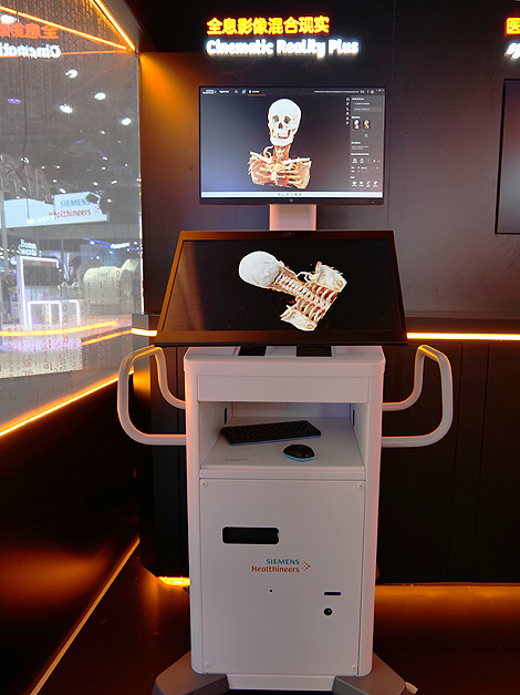 在本届进博会的西门子医疗展位,索尼空间现实显示屏与西门子新发布的医学图像处理平台深度集成,组成“全息影像混合现实”方案,实现人体器官的沉浸式立体可视化,让医生可以裸眼观看高度逼真的三维影像,更直观、立体地观察细节,增强对复杂解剖结构的认知和把握。