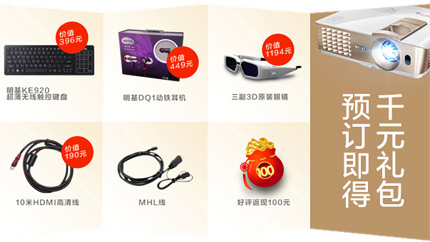 明基智能专业家用投影机i700预售价仅7699元,在10月14日起至10月20日期间凡成功预购明基i700的用户,均可享有无比心动的豪华大礼包,内含价值449元的明基DQ1动铁耳机、价值396元的2.4G十米远控无线触控键盘KE920、价值1194元的3副原装3D眼镜、价值190元的10米超长HDMI高清线,及让你手机小屏瞬间变大屏的MHL线材等。