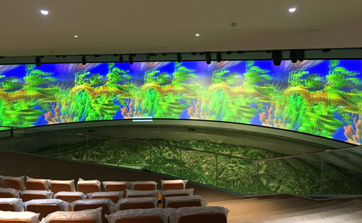 该馆采用环幕无缝投影融合系统,整个屏幕高5米,弧长50米,此次采用了DP 8台12000流明的3片DLP激光投影机,实现了DP出众的主动3D显示技术,此外采用HL